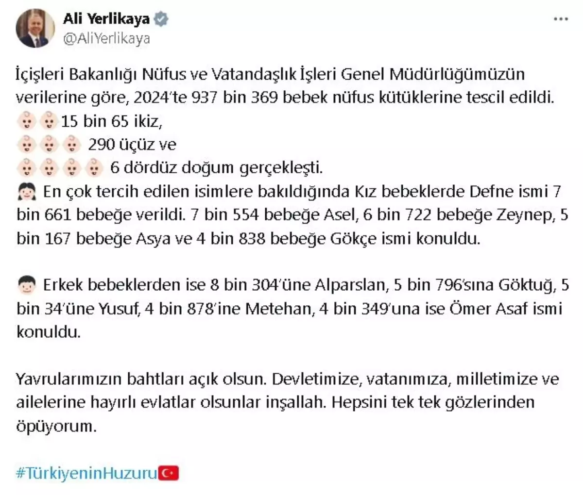İÇİŞLERİ Bakanı Ali Yerlikaya, geçen yıl 937 bin 369 bebeğin nüfus kütüklerine tescil edildiğini açıkladı. Bakan Yerlikaya, sosyal medya hesabından…